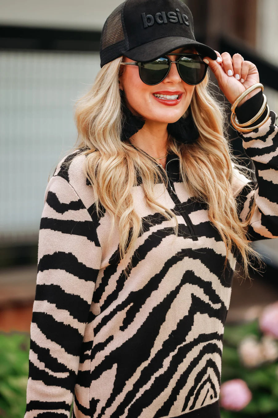 Step into style with the Savannah Stride Quarter Zip, where bold meets effortless. Featuring a striking zebra print, classic collar, and easy quarter-zip design, this pullover is the perfect balance of chic and playful. Whether you’re layering it for a casual outing or making it the star of your outfit, this piece brings a touch of the wild to your everyday wardrobe.