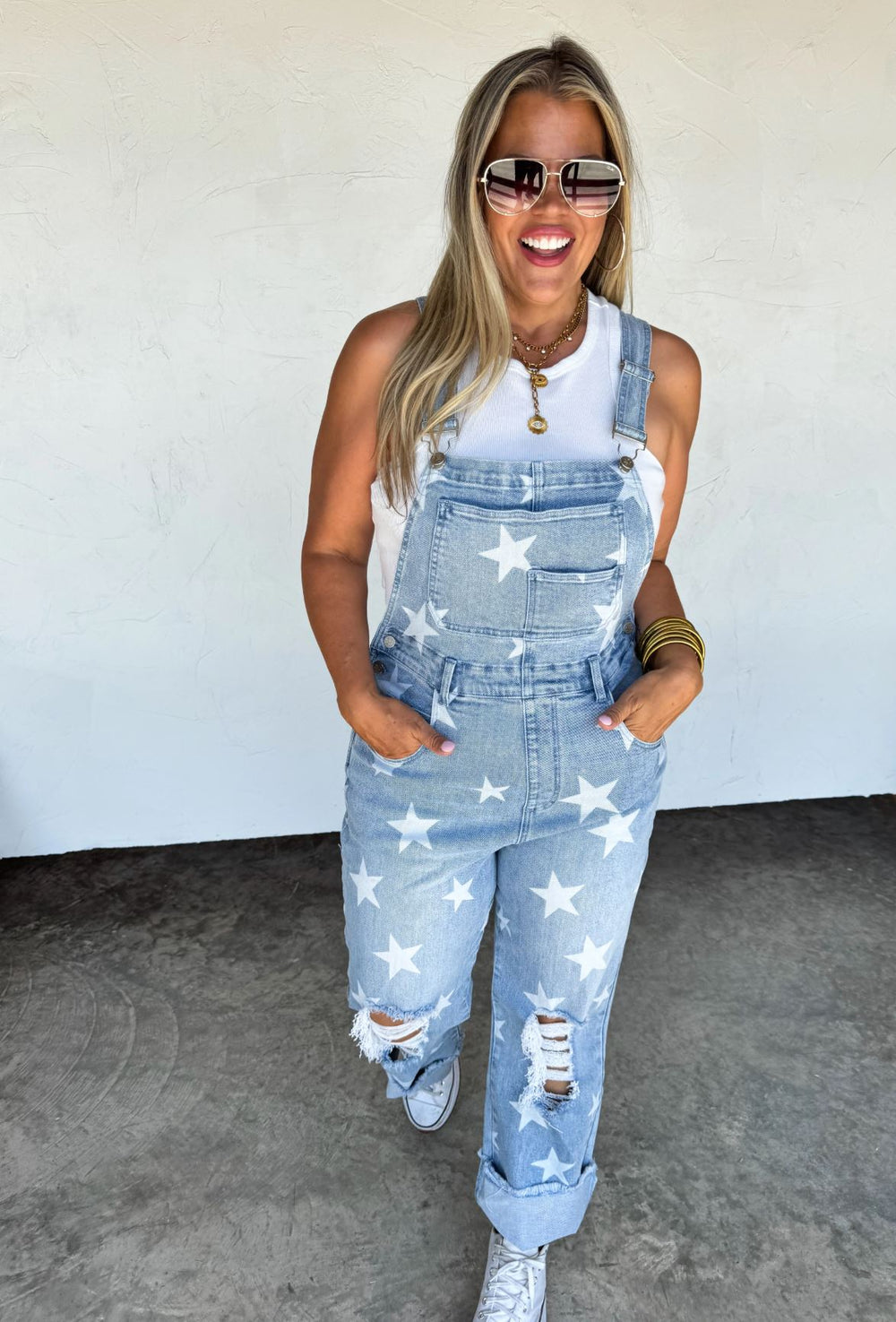 Step into effortless style with our Star Spangled Overalls—now in a gorgeous light wash denim with bleached star designs for a touch of Americana charm! Designed with the perfect amount of stretch, these overalls offer a flattering fit and all-day comfort you’ll love.