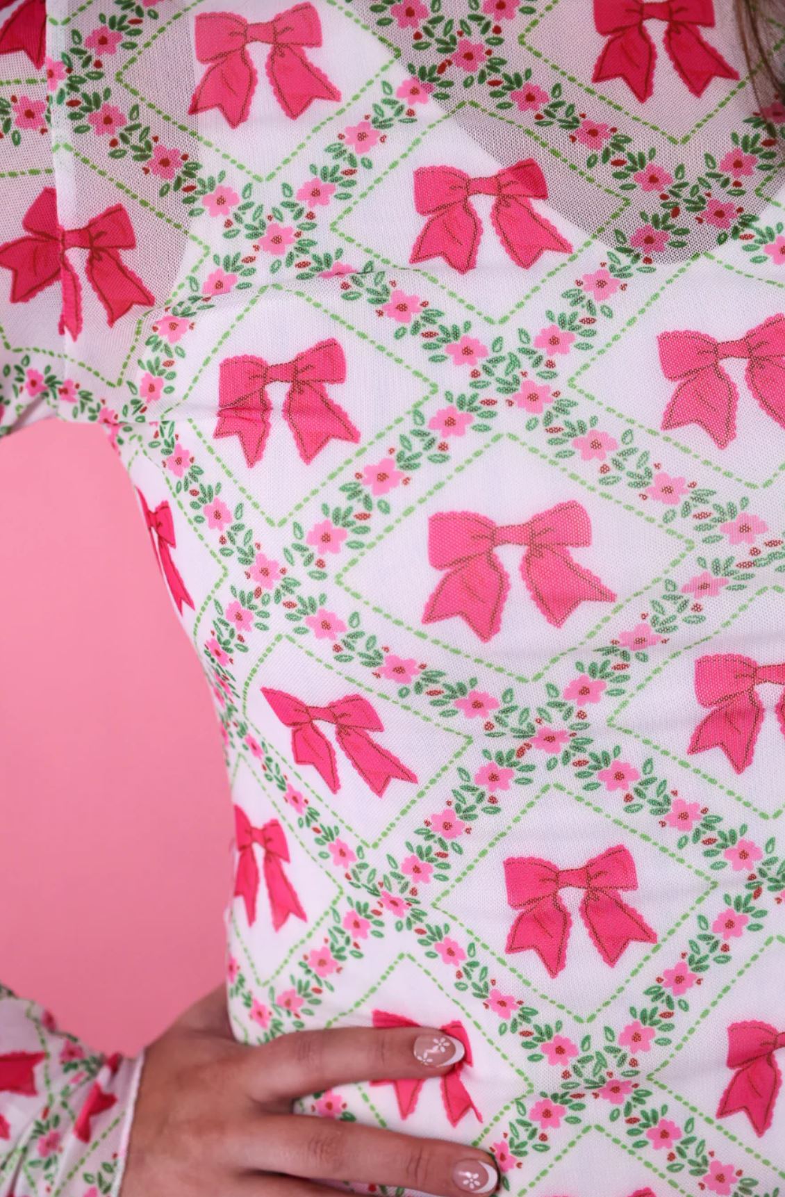 Sweet meets statement in The Bow So Chic Mesh Top. This sheer mesh beauty features a charming bow-and-lattice print that instantly elevates any outfit. Designed with a mock neckline and delicate lettuce hems, it adds just the right amount of detail while keeping the silhouette sleek and modern.
