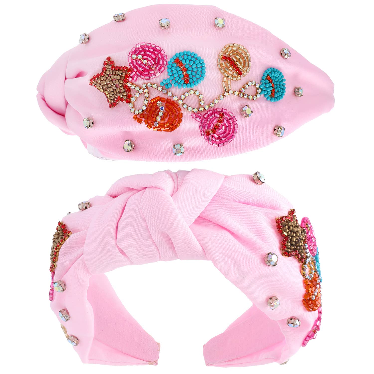 Bring whimsical holiday sparkle to your style with our Sugarplum Ornament Beaded Headband. Set on a soft blush pink base, this playful accessory is decorated with vibrant hand-beaded ornaments in shades of turquoise, pink, orange, and gold, accented by rhinestone details for extra shimmer. The cushioned top-knot design provides a secure, comfortable fit, making it both stylish and easy to wear all day long.