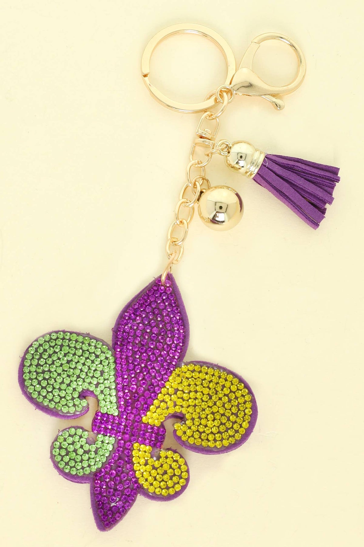 This dazzling rhinestone fleur-de-lis shines in bold purple, green, and gold—capturing the heart and soul of New Orleans in one glittery charm. Finished with a gold-tone clasp, a shiny bead accent, and a playful purple tassel, it’s the perfect way to dress up your keys, bag, or Mardi Gras fanny pack.