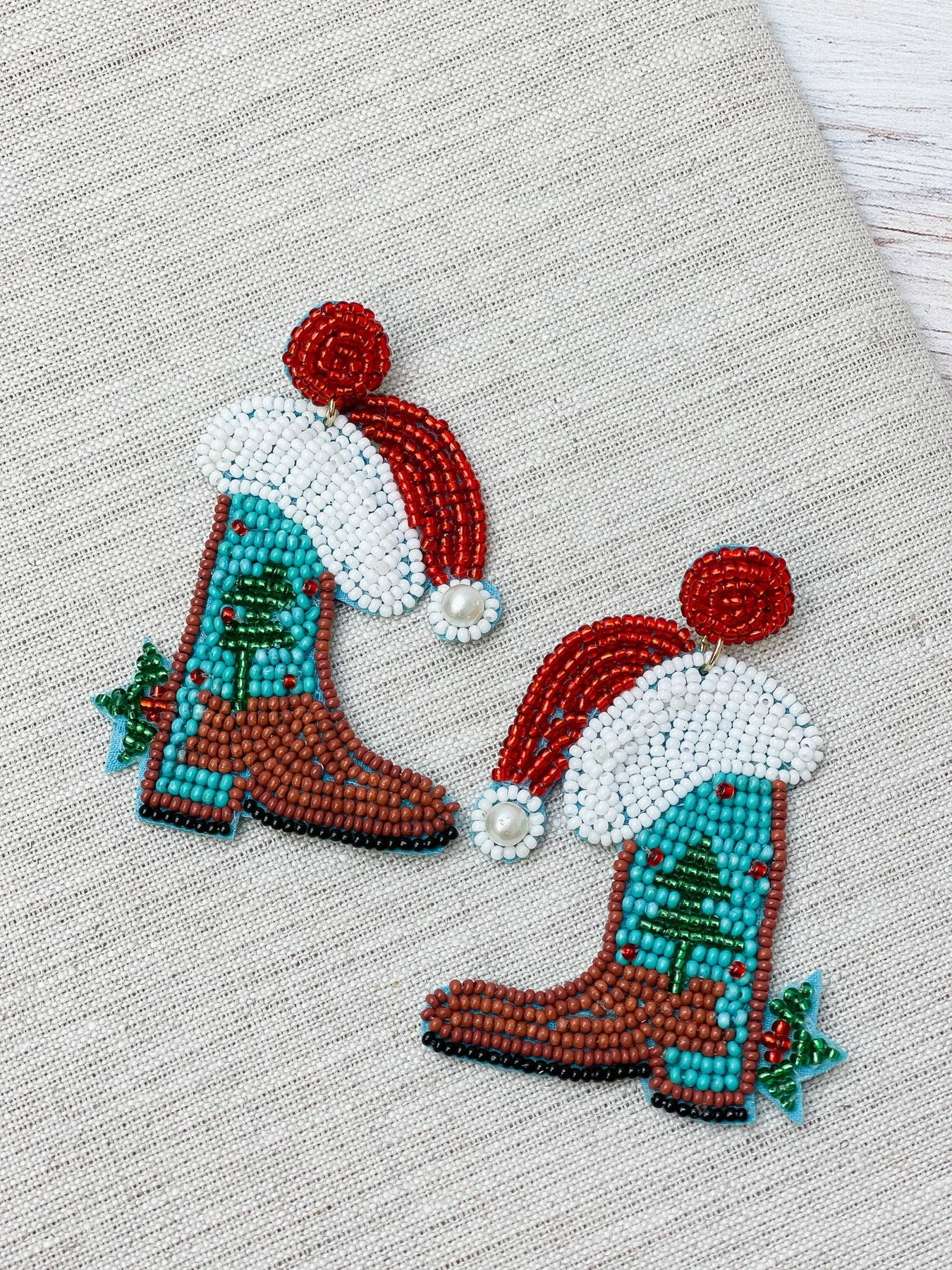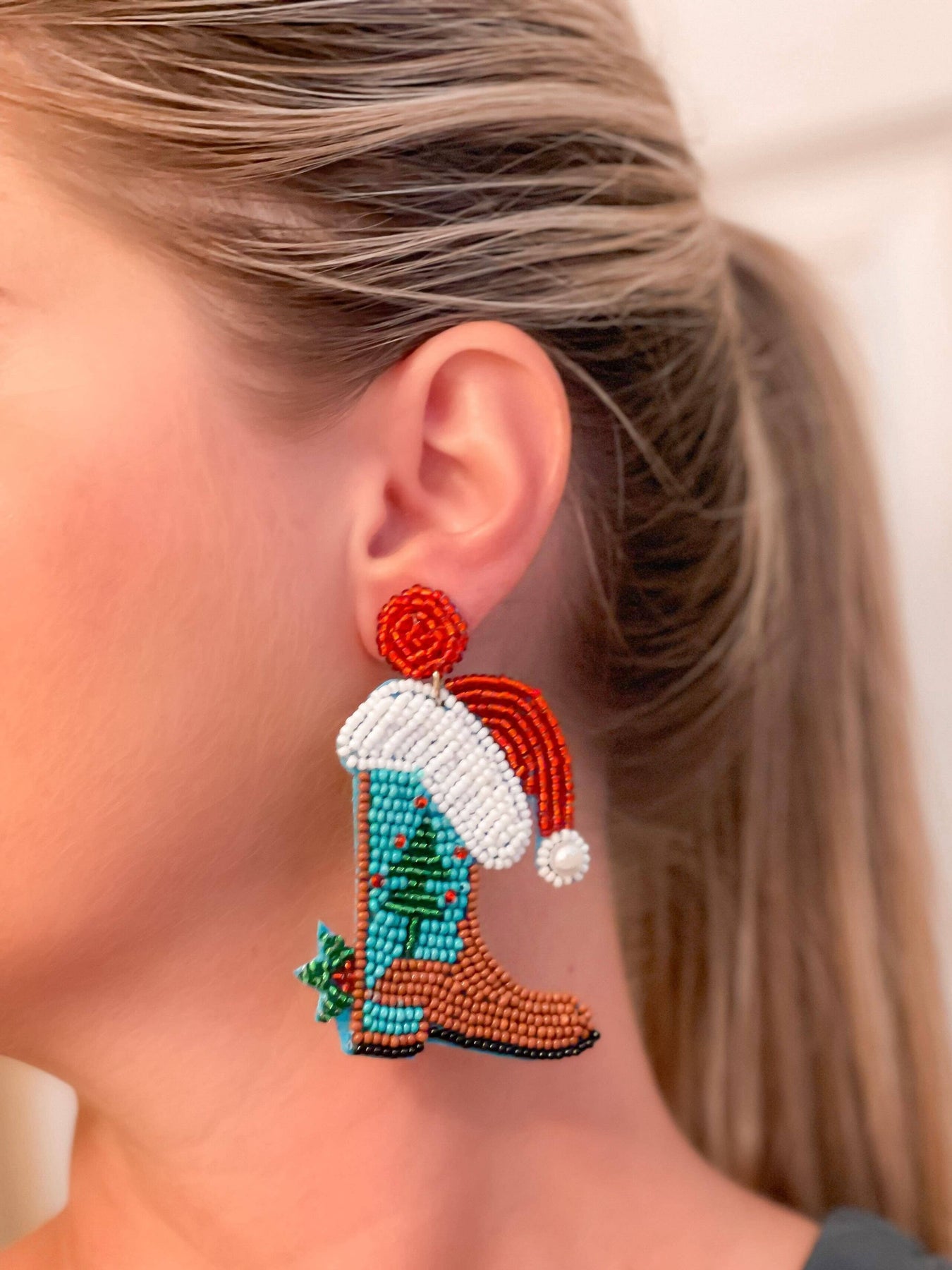 Sleigh your holiday style, cowgirl! đ¤ đ⨠Our Howdy Holidays Beaded Boot Earrings are the ultimate festive statement piece. Hand-beaded with vibrant colors, these whimsical boots feature a sparkling Christmas tree, a Santa hat topper, and all the Western charm your holiday wardrobe needs. Lightweight enough for all-day wear but bold enough to turn heads, theyâre perfect for holiday parties, gift exchanges, or adding a little yee-haw cheer to your everyday looks. Pair them with your favorite cozy sweater or sequin top and let the compliments roll in!