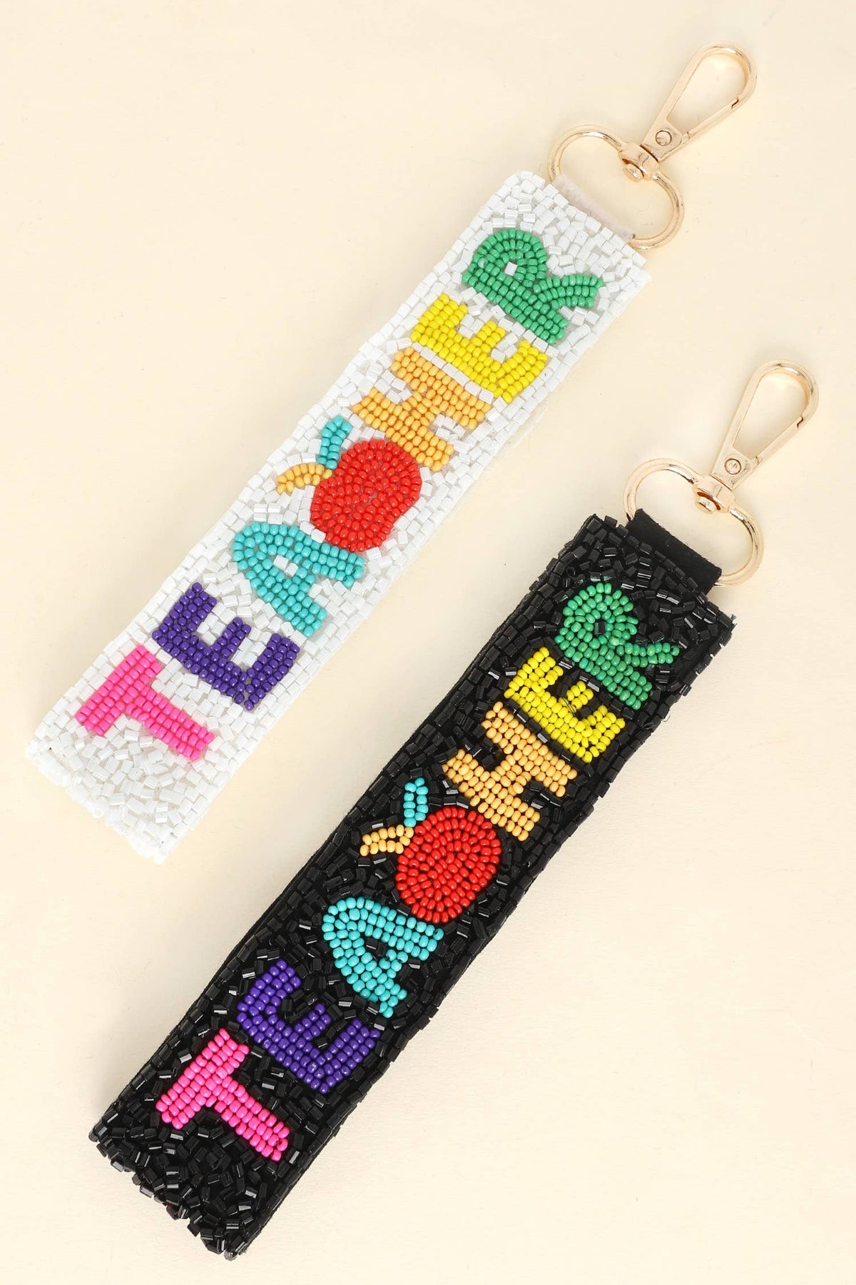 Show off your love for teaching in colorful style with the Teacher Pride Beaded Keychain! Measuring 8" in height and 1.3" in width, this long strip keychain is beautifully hand-beaded with bright, playful lettering and an apple accent—available in two color options: classic black or crisp white. Crafted from high-quality materials for durability and everyday use, it’s perfect for keeping your keys organized or adding a cheerful touch to your tote or lanyard. A thoughtful and stylish gift for teachers, aides, and education professionals who inspire every day.