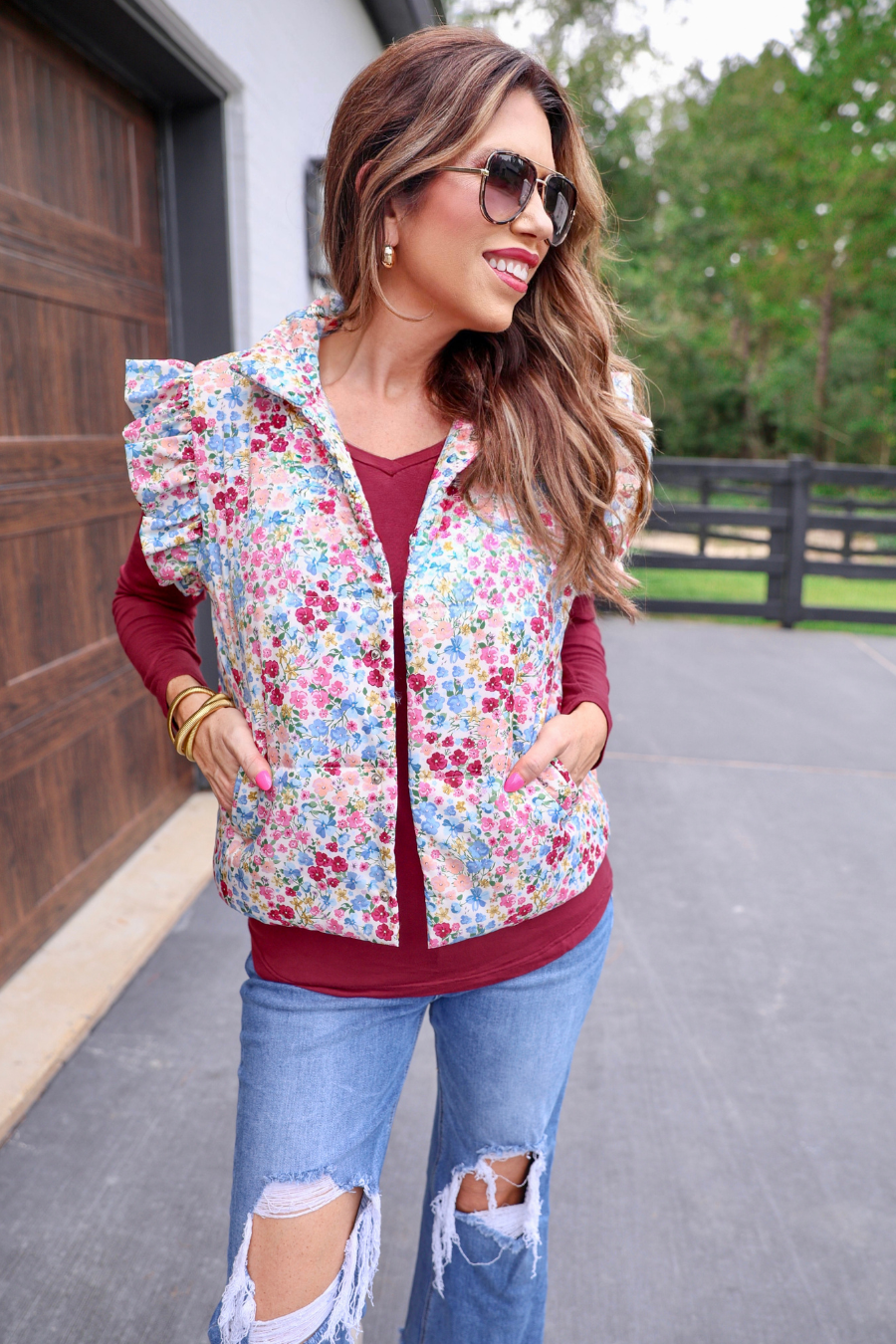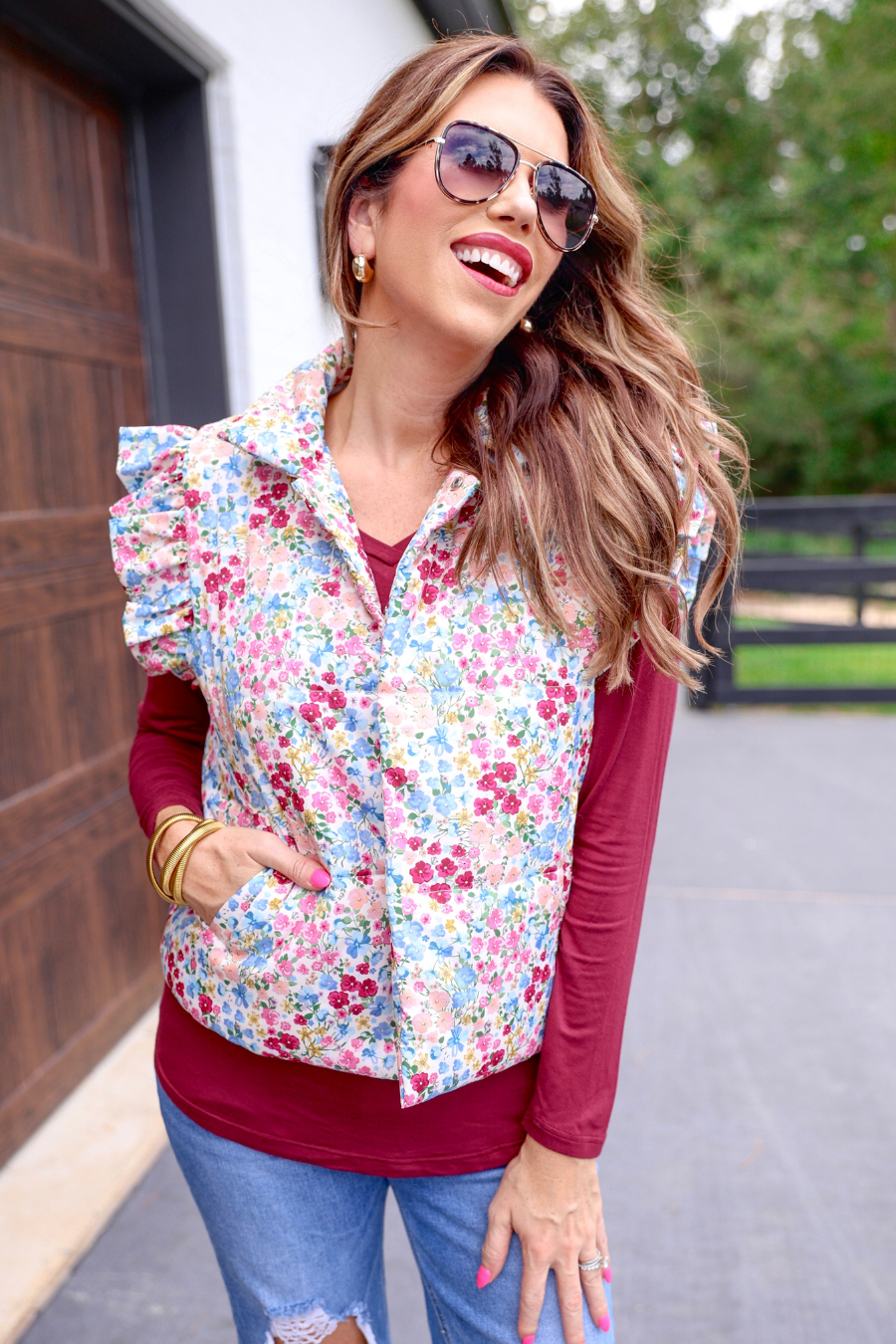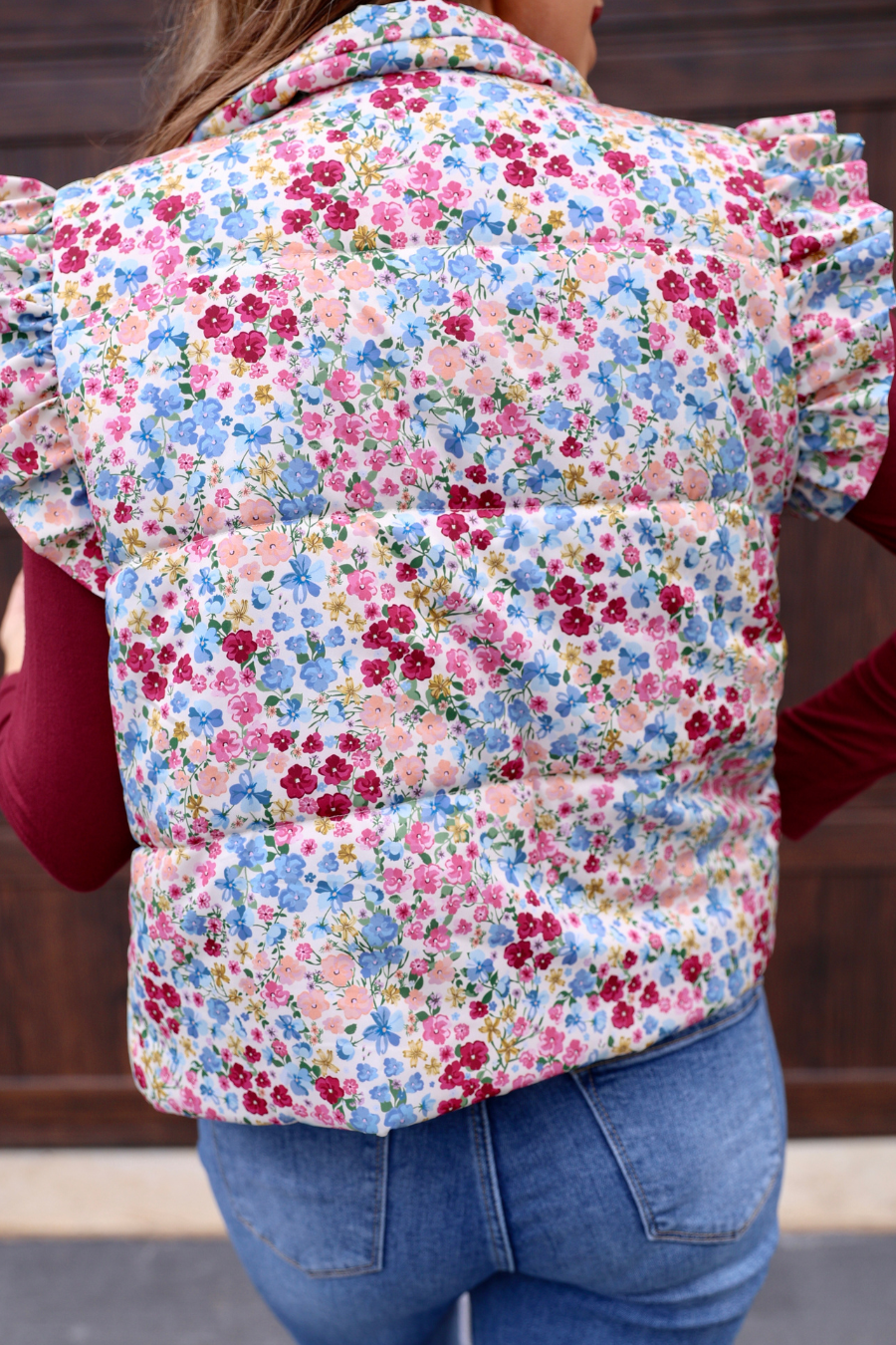 Step into year-round charm with our Garden Stroll Puffer Vest! Bursting with a playful mix of florals, this vest brings a pop of color and joy to any outfit. The lightweight puffer design makes it perfect for layering in every season, while the ruffled shoulder detail adds just the right amount of feminine flair. Whether you’re tossing it over a tee in spring, pairing it with a cozy sweater in fall, or brightening up your winter look, this vest is the versatile piece your closet has been waiting for.