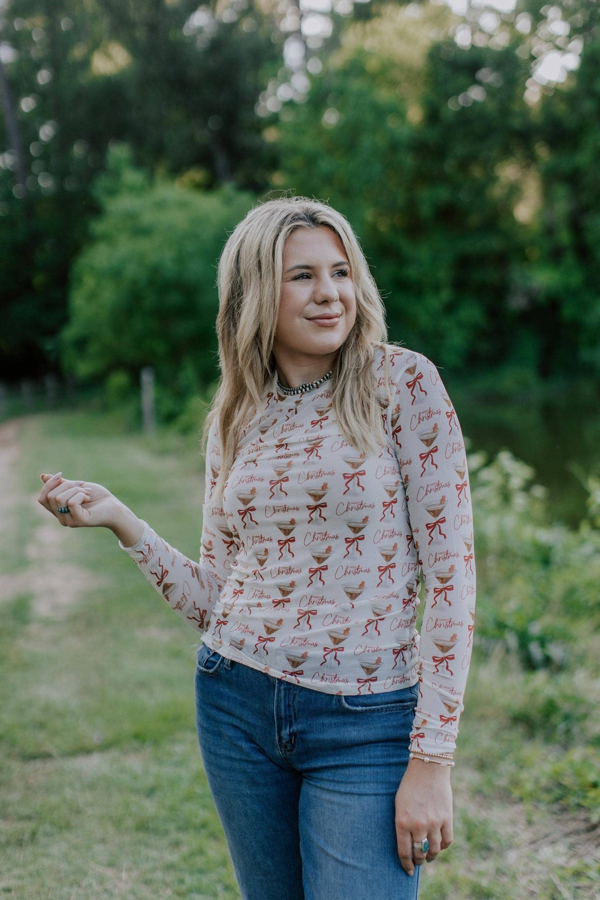 Shake up your holiday style with our Merry Martini Mesh Top! 🍸 Featuring a playful martini glass and bow print, this festive mesh tee is the perfect blend of flirty and fun. The lightweight, stretchy fabric makes it easy to layer for a cozy night in or a glam holiday outing.