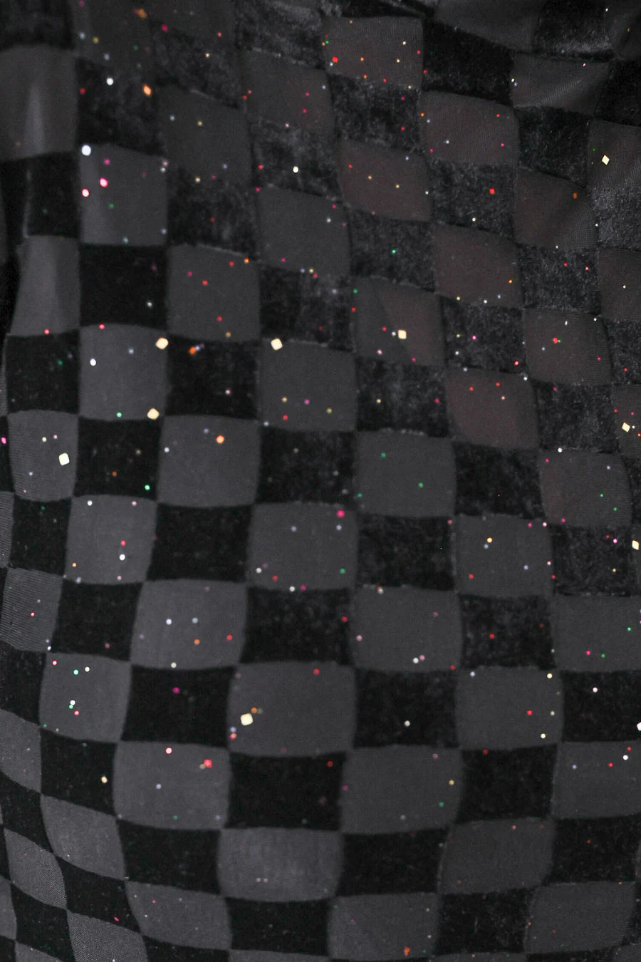 Step into the spotlight with our Midnight Spark Top—a dazzling blend of velvet and mesh in a bold checkered pattern. With its glittery accents, mock neckline, and sheer-meets-velvet design, this piece is the perfect mix of edgy and elegant. Whether you’re sipping champagne at New Year’s, cozying up for a holiday date night, or hitting the dance floor, this top brings the glam factor every time. Pair it with sequins, leather, or denim—either way, you’ll be serving looks all night long.