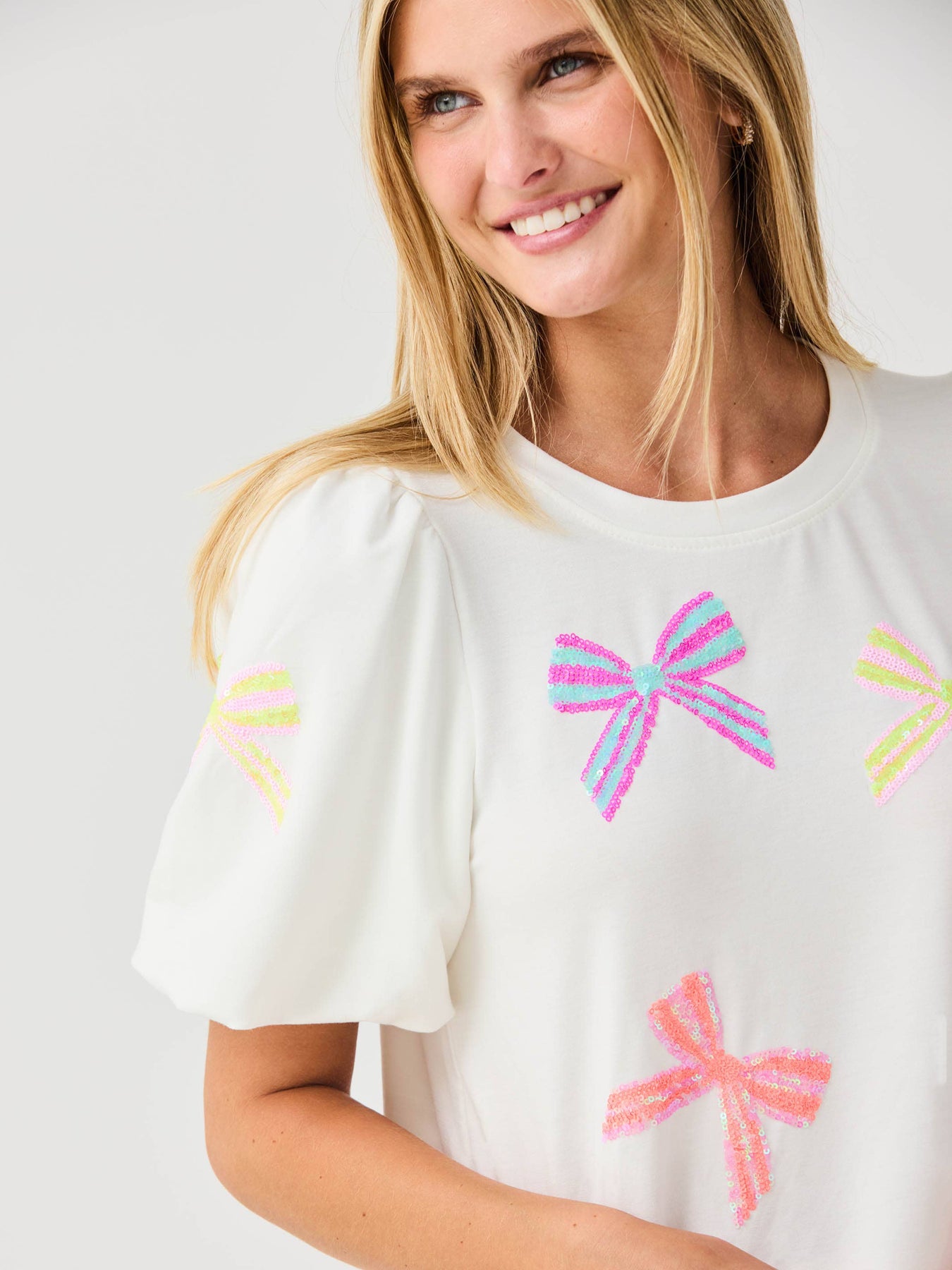 Add a little sparkle to your day with this playful set featuring colorful sequin bows. Designed with puff sleeves and a relaxed fit, it’s the perfect mix of comfy and cute. The drawstring waistband with gold end caps gives it a polished finish for easy, everyday wear.
