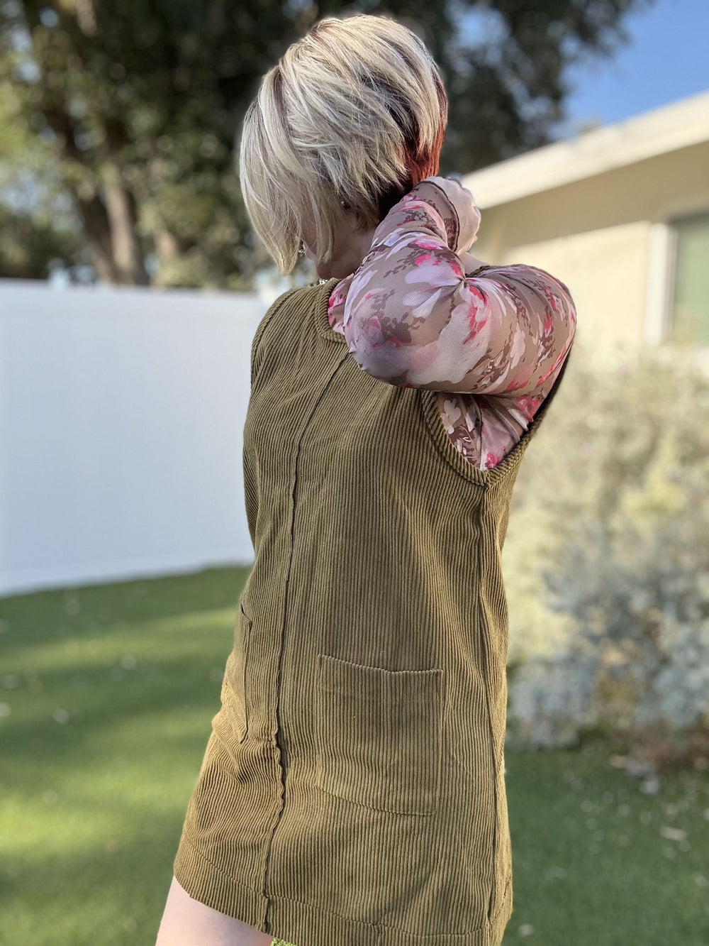 Effortlessly chic and endlessly versatile, this olive mini corduroy dress is a closet staple you'll wear on repeat. Featuring a classic round neckline and sleeveless design, it's perfect for layering or wearing solo. The raw edge detailing adds a touch of casual charm, while the front pockets combine style with functionality. The soft corduroy fabric offers both texture and comfort, making it ideal for everything from brunch with friends to a day of errands. Pair it with ankle boots and a cardigan for cozy vibes or dress it up with statement jewelry and heels for an elevated look.