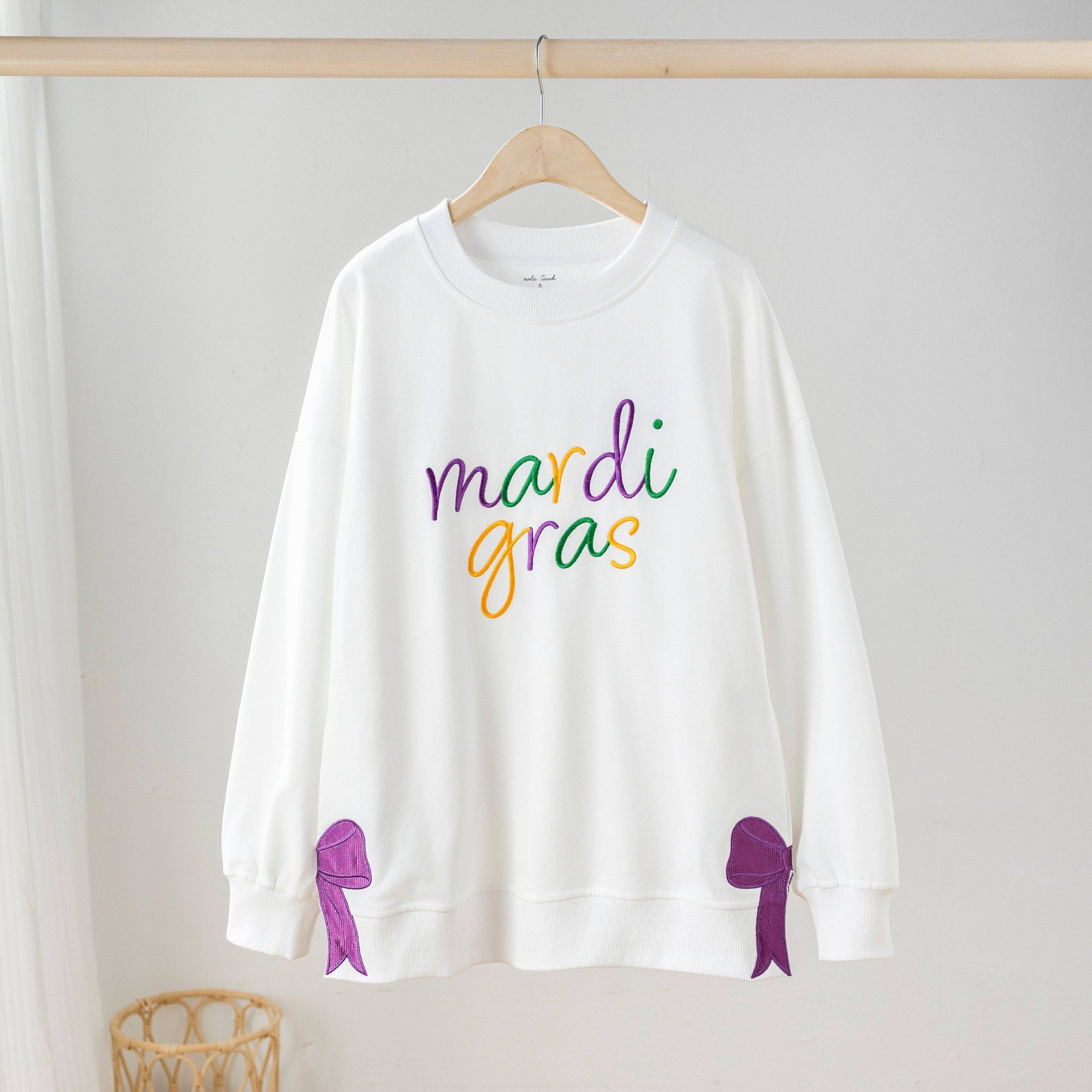 Add a little charm to your Carnival look with the Beads & Bows Sweatshirt! This cozy and festive top brings all the Mardi Gras magic with its embroidered “mardi gras” design in vibrant purple, green, and gold. The real showstoppers? Two shiny purple bow appliqués on each side that give this comfy classic a perfectly playful twist.
